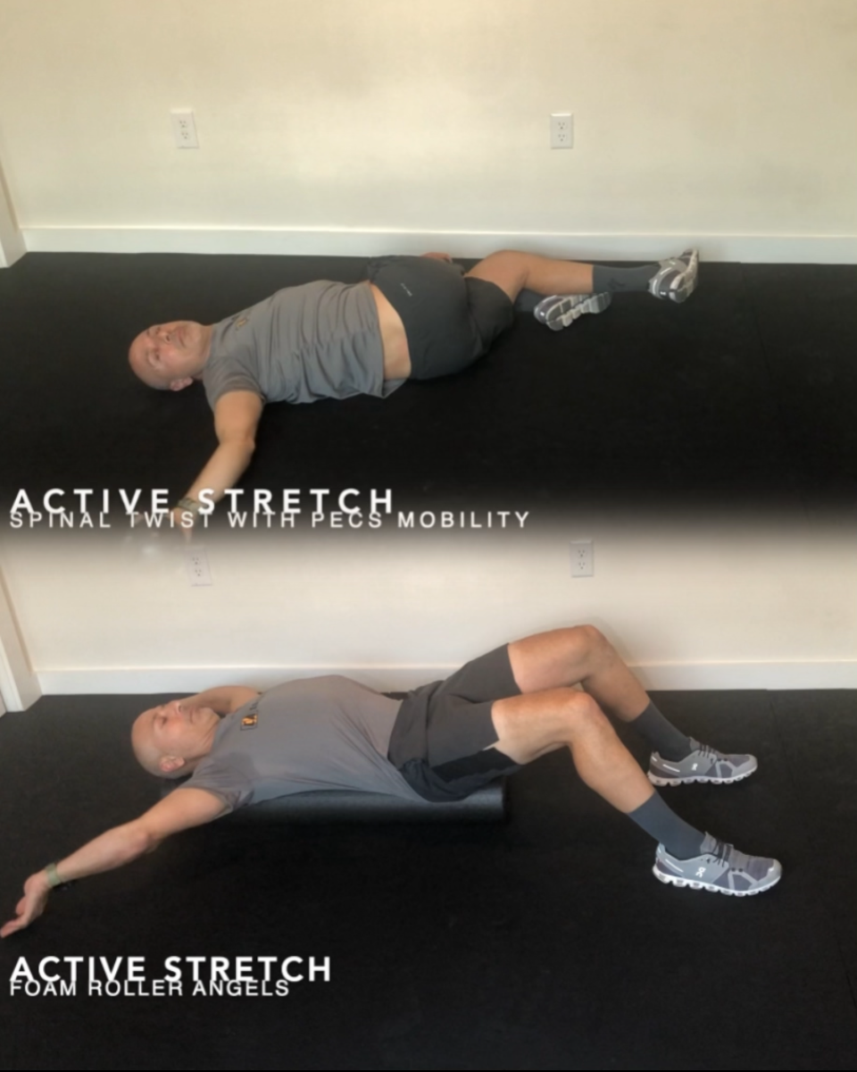 Two of my go-to Friday stretches to prep for the weekend: spinal twists to unlock rotation and pecs, and foam roller angels to open up the chest and restore posture. Active recovery isn’t flashy—but it makes everything else better.